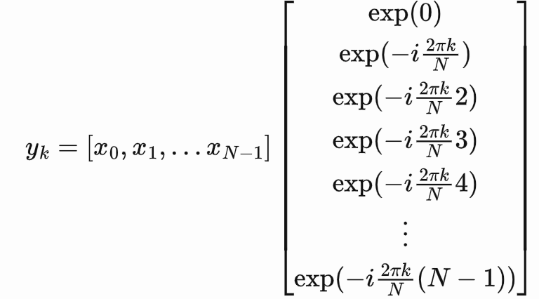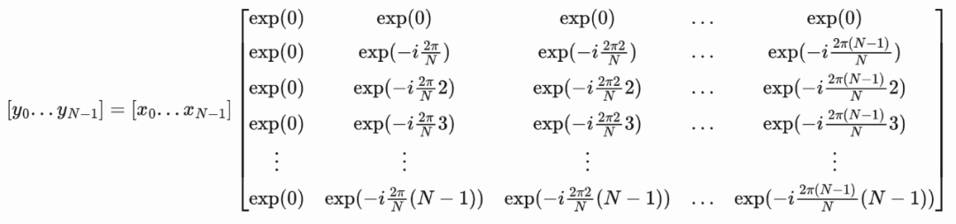 不过通常情况下,我们要计算全频谱,即k从[0,1,…N-1]的值,这可以用一个矩阵来表示(k按列递增,n按行递增):