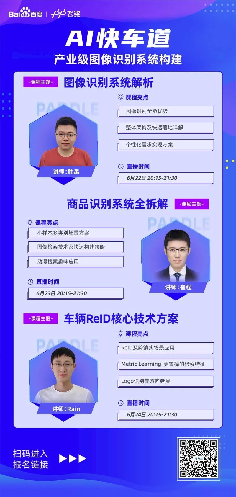 6.22-24日每晚 8:15-9:30 百度高工将为我们带来产业级图像识别系统构建的深度解析和核心方案,小伙伴们快戳二维码抢座,我们直播间不见不散~~