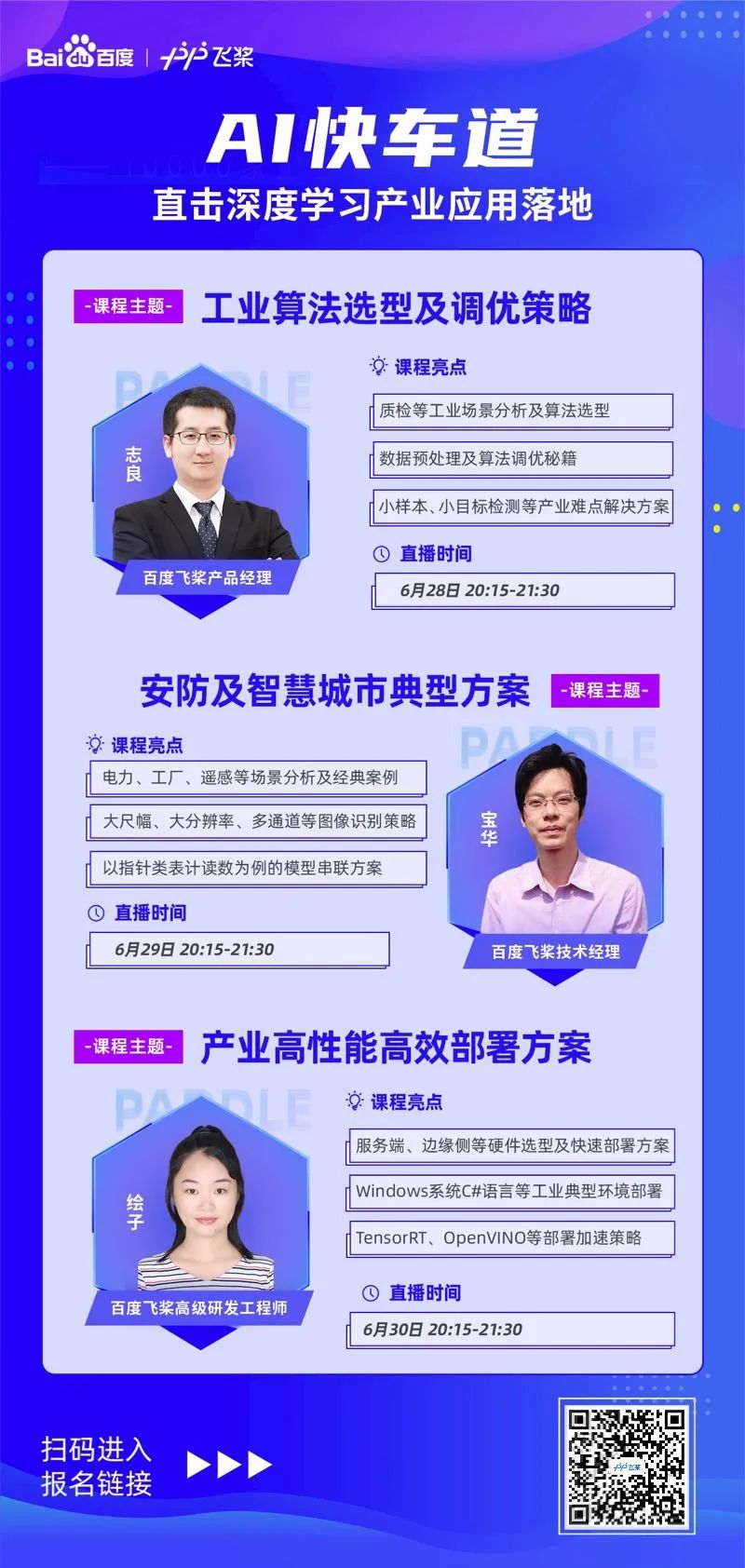6.28-30日每晚 8:15-9:30 百度高工将为我们带来直击深度学习产业应用落地的精彩直播课,小伙伴们快戳二维码抢座,我们直播间不见不散~~
