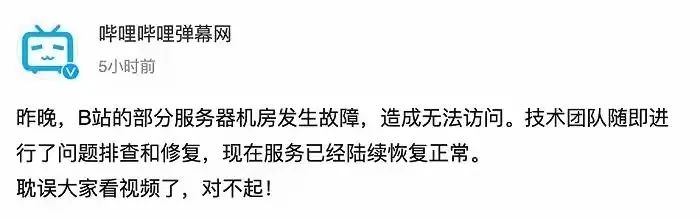 今日凌晨,B 站发布公告称,昨晚,B 站的部分服务器机房发生故障,造成无法访问。技术团队随即进行了问题排查和修复,现在服务已经陆续恢复正常。