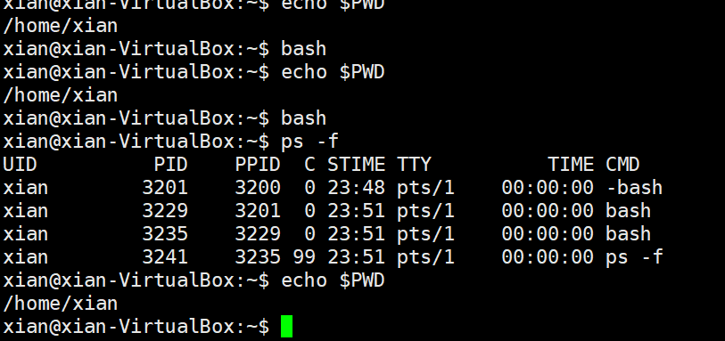 5. 进入子 shell,在子 shell 中查看 $PWD 变量
