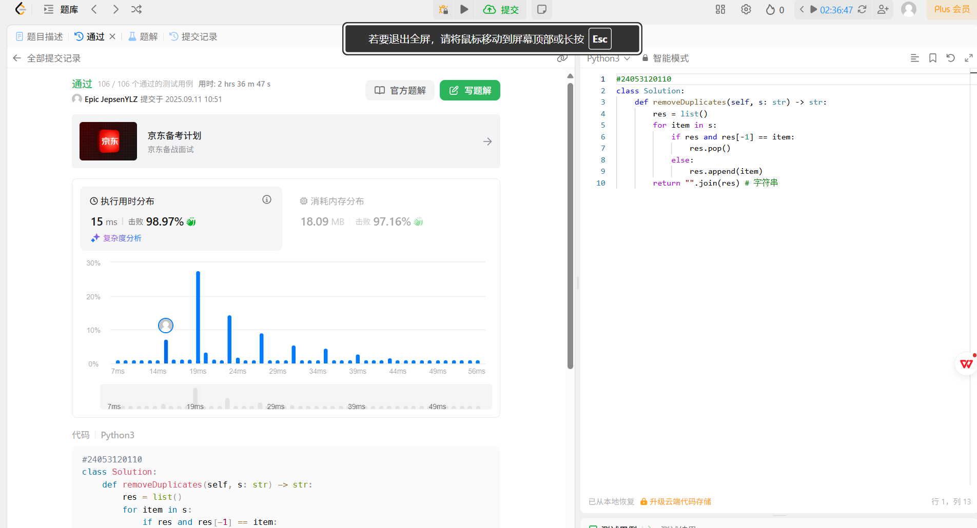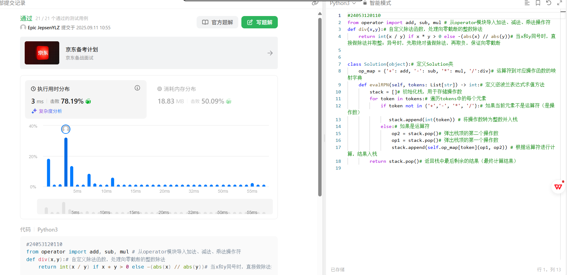 3. 遍历结束后 遍历完整个逆波兰表达式后,栈中应该只剩下一个元素,这个元素就是整个逆波兰表达式的计算结果,将其返回即可。 复杂度分析 时间复杂度:需要遍历逆波兰表达式一次,时间复杂度为 O(n) ,其中 n 是逆波兰表达式中元素 的个数。 空间复杂度:在最坏情况下,栈中会存储所有的操作数,即空间复杂度为 O(n) 。