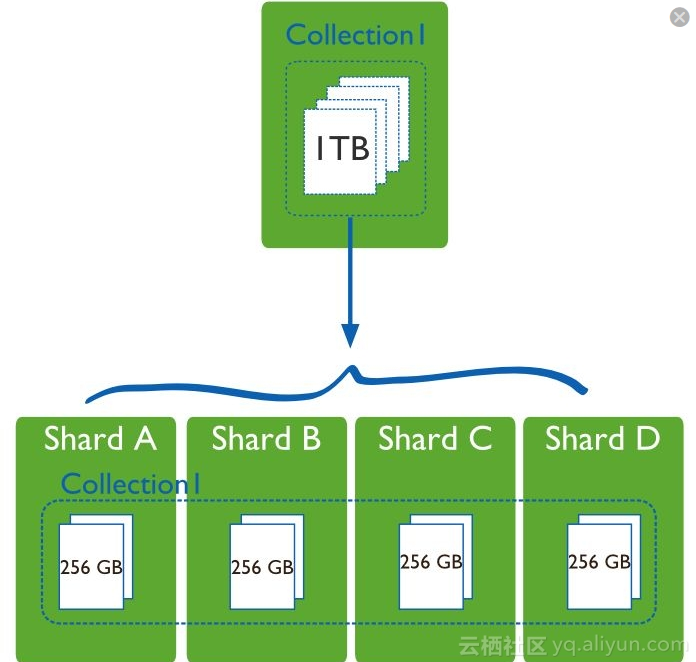 如图,集合是根据字段来进行分片。根据字段的范围不同将一个集合的数据存储在不同的分片中。