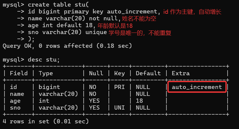 -- 约束id字段只能有唯一值
