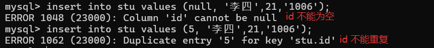 ERROR 1062 (23000): Duplicate entry '1' for key 'stu.id'