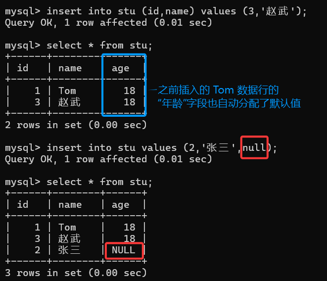 在没有指定年龄实际值为多少时,默认插入是18;当手动指定是 null 值的时候就是 null:
