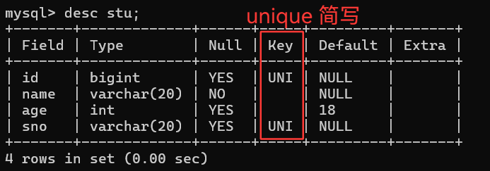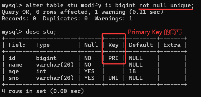mysql> alter table stu modify sno varchar(20) UNIQUE;