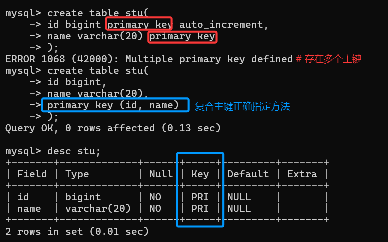 ERROR 1062 (23000): Duplicate entry '1-Tom' for key 'stu.PRIMARY' # 显示主键冲突,是由id和name两个列共同决定冲突与否的