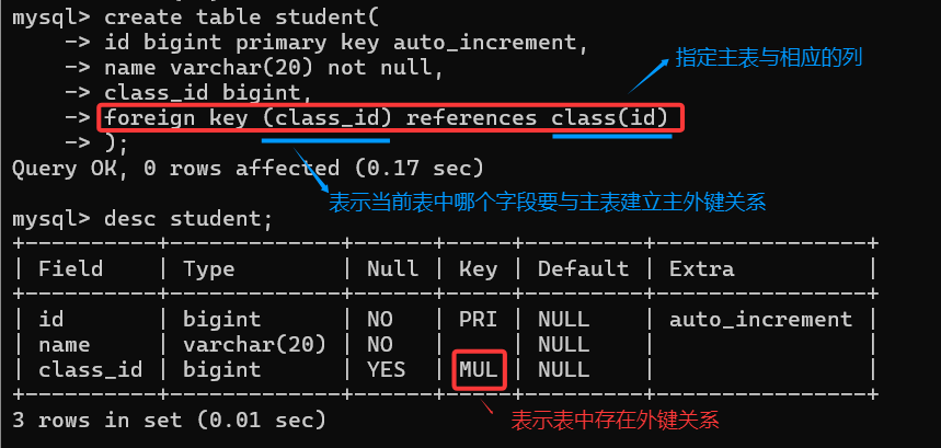 ERROR 1452 (23000): Cannot add or update a child row: a foreign key constraint fails (`learnsql`.`student`, CONSTRAINT `student_ibfk_1` FOREIGN KEY (`class_id`) REFERENCES `class` (`id`))