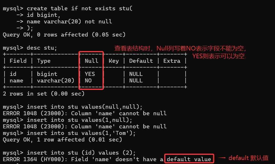 创建表时定义某个列不允许为 null (必填)时,则插入数据时,必须在该列写入有效数据。