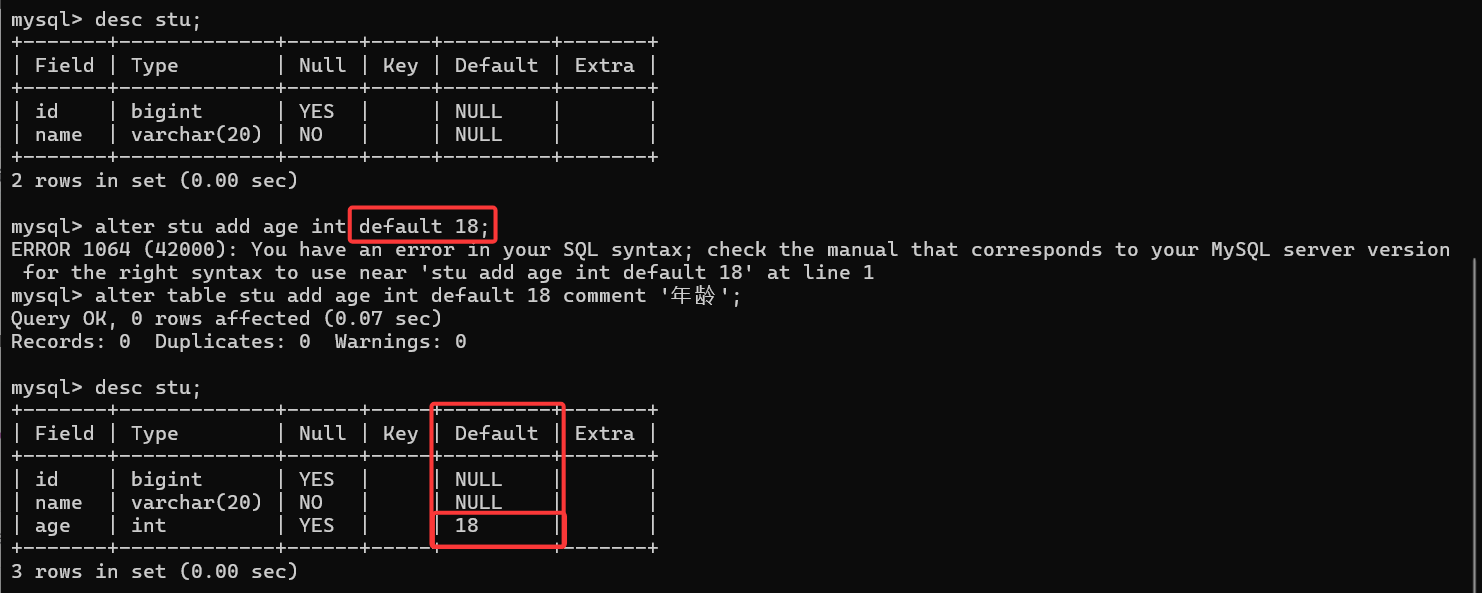 示例:向学生表新插入一列 age,并设置默认值: