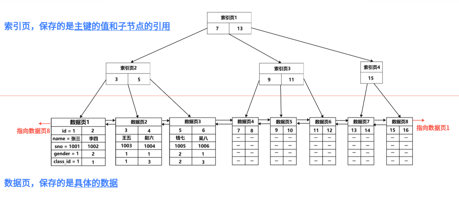 非叶子节点保存索引数据,叶子节点保存真实数据。
