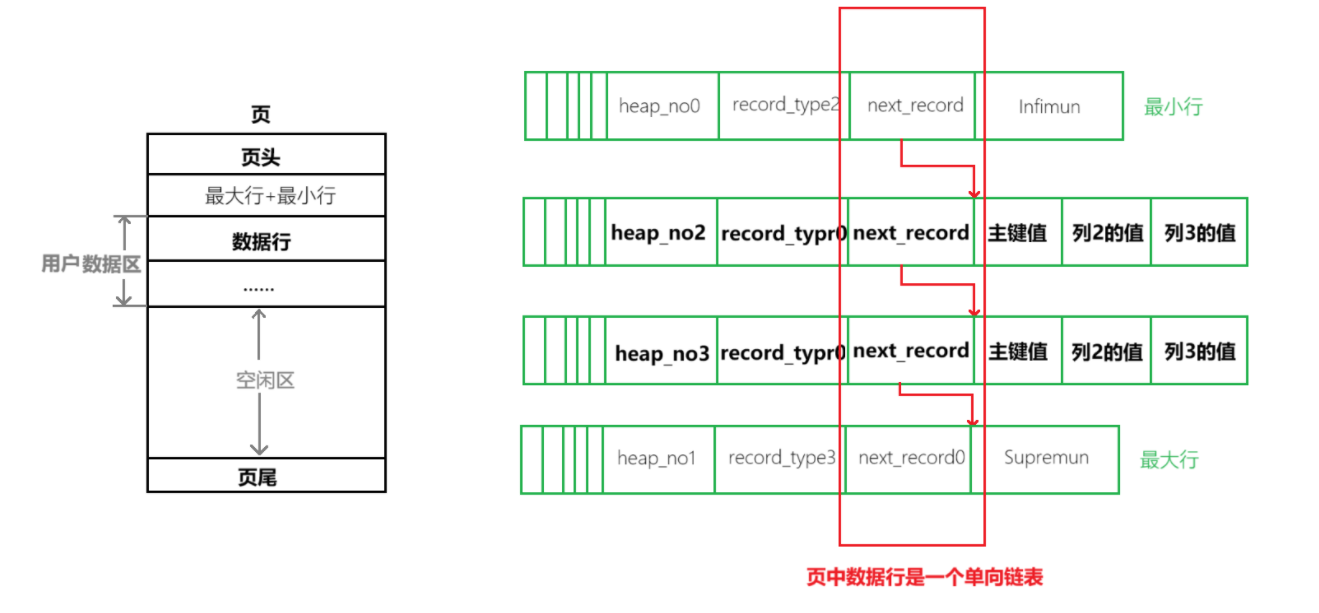 第一个数据行有一个记录下一行的地址偏移量的区域 next_record 将页内所有数据行组成了一个单向链表,此时新页的结构如下所示: