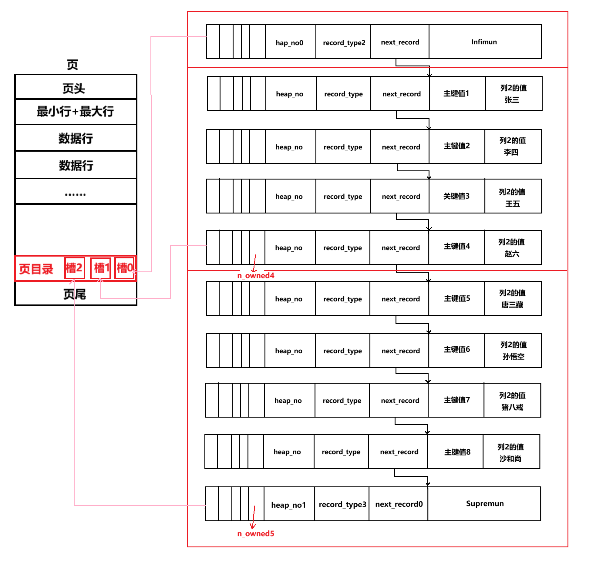 同时把每个组最后一行在页中的地址,按主键从小到大的顺序记录在页目录中,在页目录中的每一个位置成为一个槽,每个槽则对应一个分组;一旦分组中的数据行超过分组的上限8个的时候,就会分裂出一个新的分组。