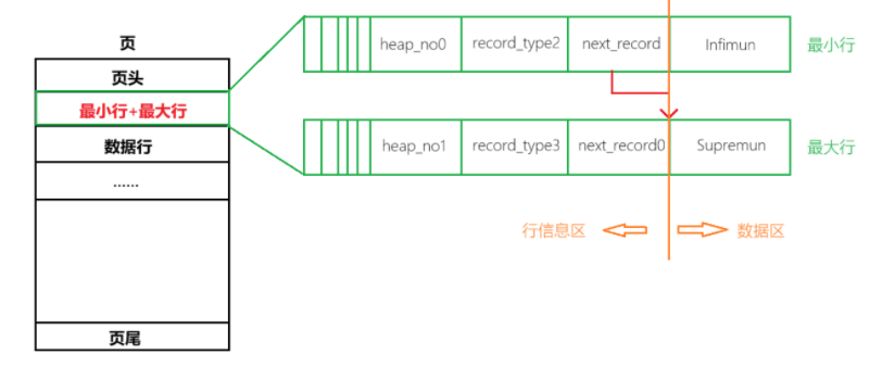 页主体部分是保存真实数据的主要区域,每创建一个新页,都会自动分配两个行,一个是页内最小行,另一个是页内最大行。这两行并不存储任何真实信息。