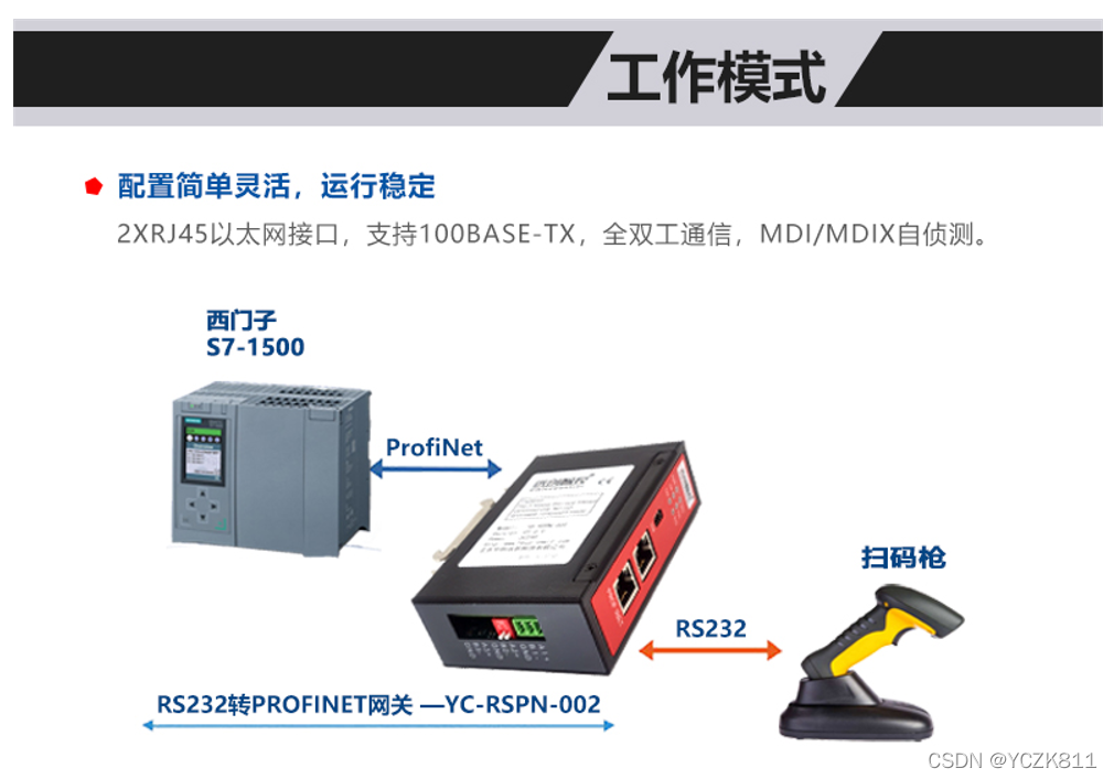 本产品YC-RSPN0-002(RS232转ProfiNet网关)通过配置,支持4 种的工作方式: