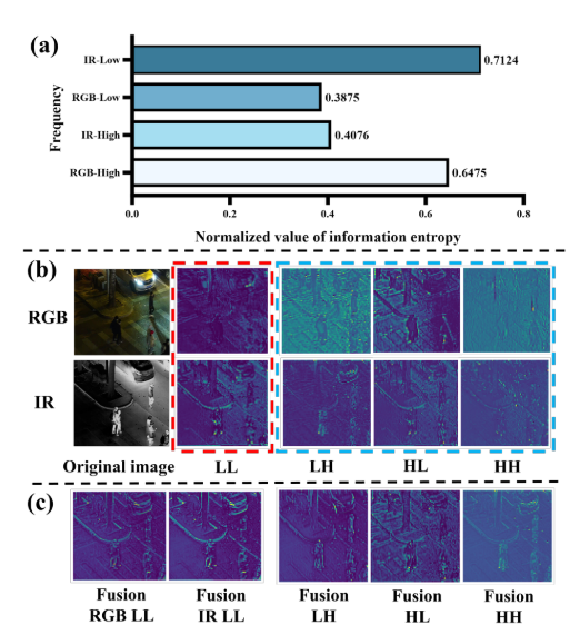 即使现有的跨模态目标检测算法表现出了优异的性能,但对于有效利用通道之间的固有特征进行优势互补仍存在不足。我们努力从频域中探索答案。如图1a所示,对M3FD的验证集使用离散小波变换(DWT)显示:IR在低频子带表现出更高的归一化信息熵;而RGB图像在高频子带表现出更高的归一化信息熵。归一化信息熵值表现出了图像所携带的信息量。笼统地说,信息熵值越大,图像的内容越丰富。这个统计结果表明rgb图像更善于捕捉高频信息,相反的,IR图像主要封装低频信号。此外,图1b表明了p2级RGB和IR特征的DWT输出,这些特征来自yolov8骨干对每个相应的通道进行训练。低频和高频分量分别被红色和蓝色虚线框标出。在低频区域,IR特征一更清晰的形状显现,而RGB特征在高频区域显现出更明显的边缘和轮廓,证实了其独特的频率特征。