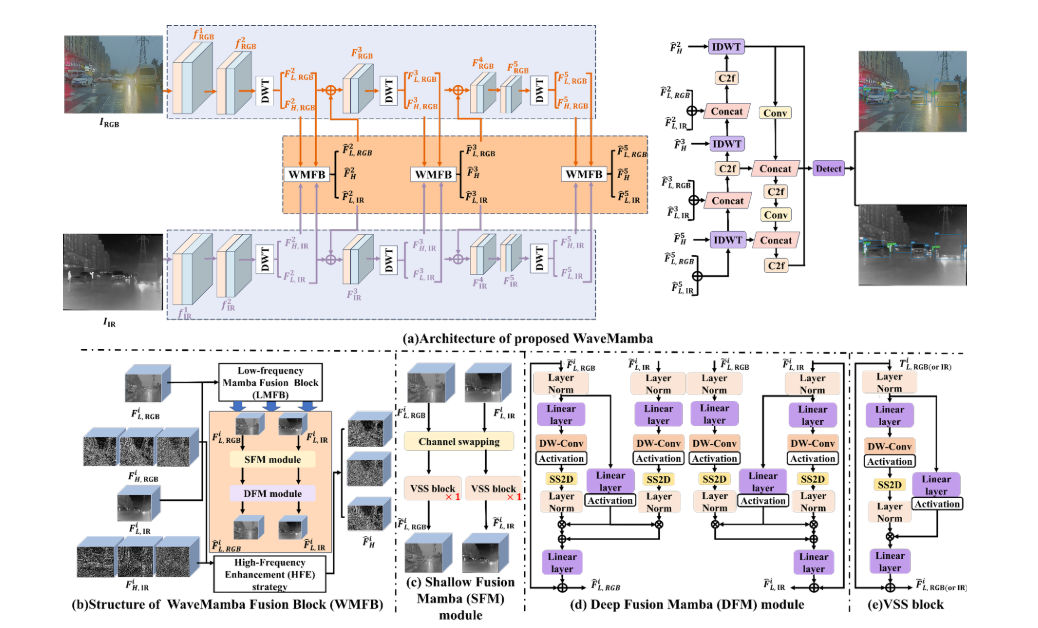 利用可见光和红外图像的互补特性,改进目标检测。提出了WaveMamba,一种使用离散小波变换(DWT)分解的RGB和IR独有的互补频率特征的跨模态融合方法。还提出了一种结合逆离散小波变换(IDWT)的改进检测头,减少了信息损失并产生最终检测结果。