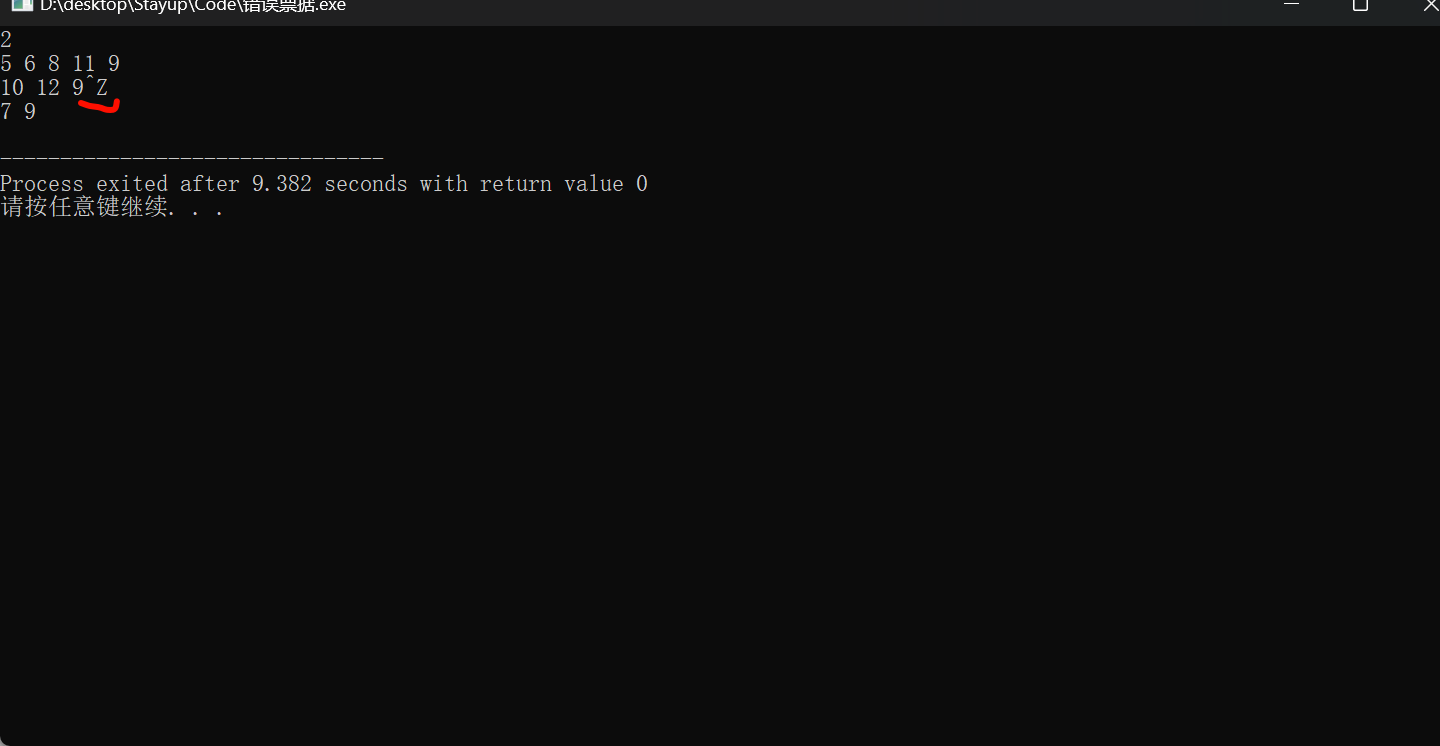 这里思路是很简单的,只要把整个数组用sort函数排序后,遍历整个数组,如果符合当前的数字减前一个数字大于等于2说明是断号,如果是相减等于0说明是重号。卡在的地方是输入的行数的长度不固定,这里会想怎么通过接受回车键来判断是否结束一行,我在查看大佬的解释是 但在c++里在读入文件结束后以EOF结束,所以我们不用理这个行数问题,直接while(cin>>x)让他一直读写就行,在读到cin>>在读到EOF后结束程序,在我们本地跑的时候会卡死循环,这是我们只要按住键盘ctrl键+z键然后再按回车键就结束了