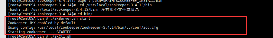 [root@localhost zookeeper-3.4.13]# export PATH=$PATH:$ZOOKEEPER_INSTALL/bin 【命令】