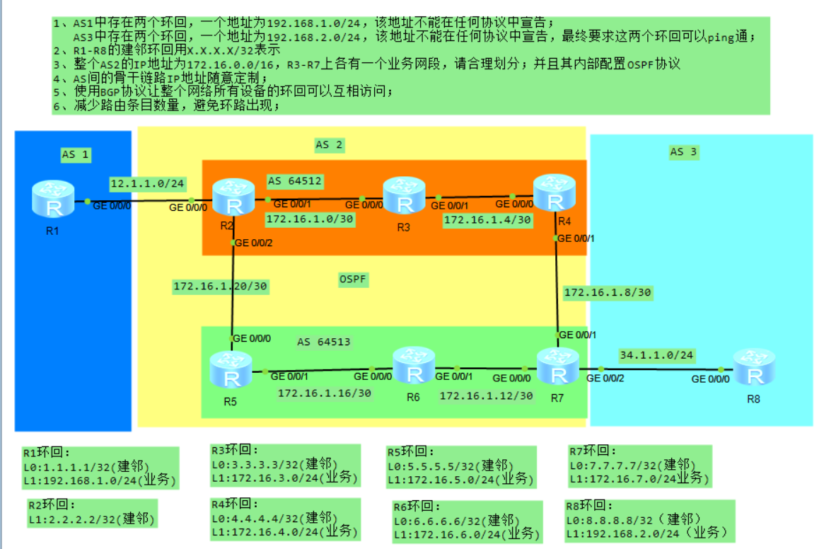 1,AS1存在两个环回,一个地址为192.168.1.0/24该地址不能在任何协议中宣告,AS3中存在俩个环回,一个地址为192.168.2.0/24该地址不能在任何协议中宣告,最终要求这两个环回可以互相通讯
