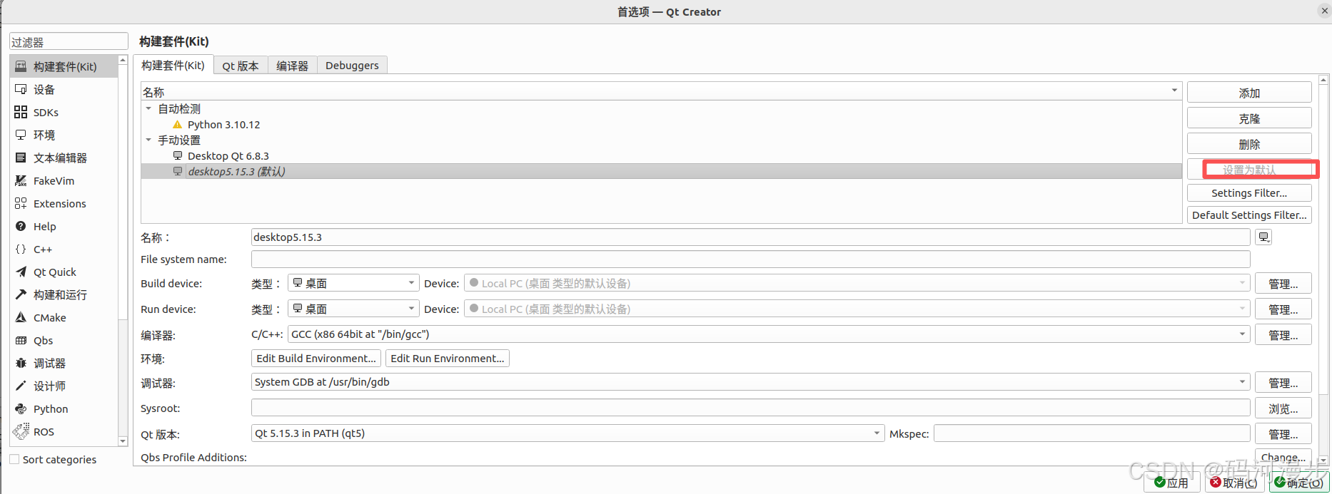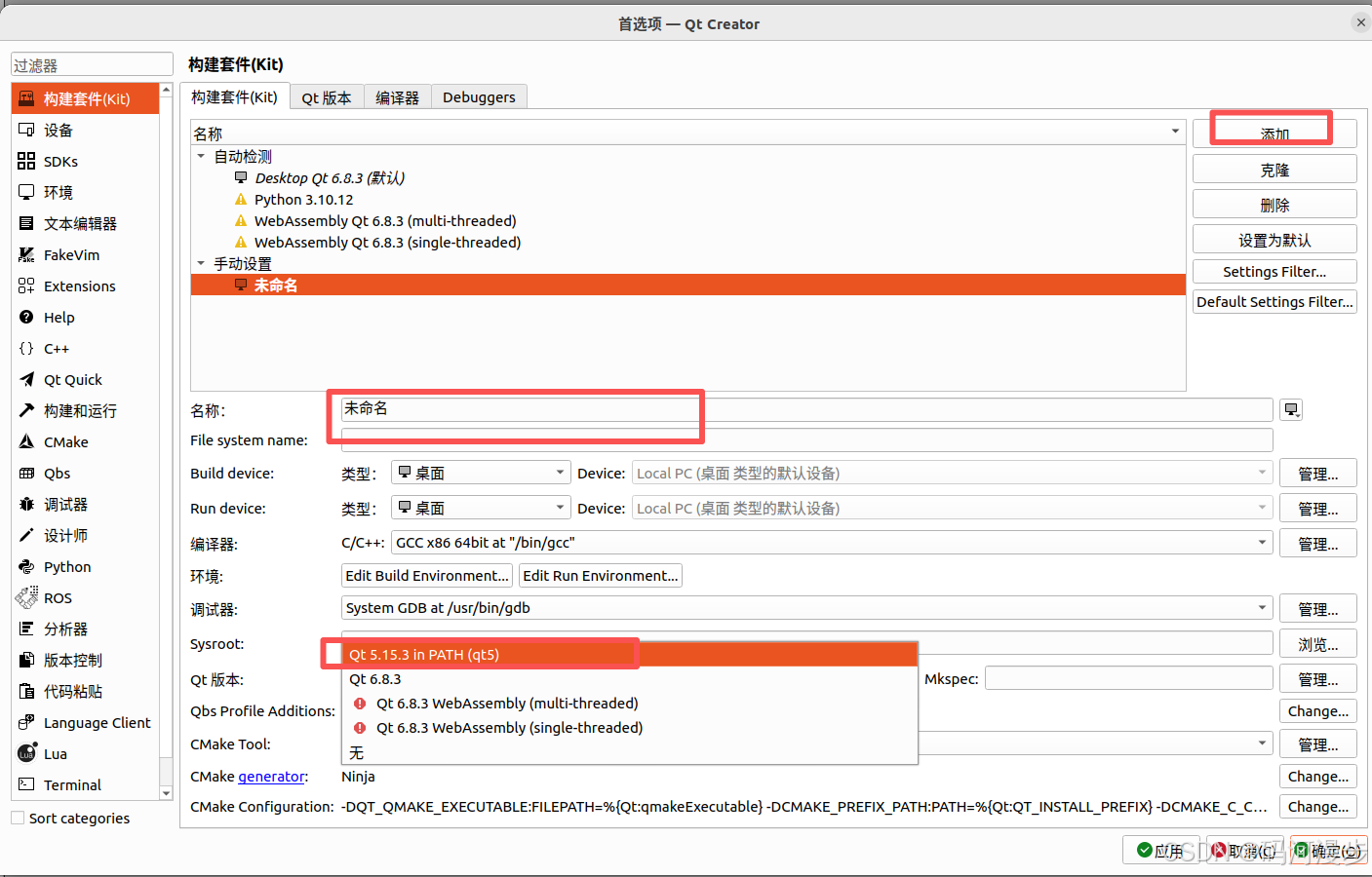 4、那我们在右边这里添加一个,然后自己命名,然后可以选择ros2 humble版本安装的Qt5.15.3版本