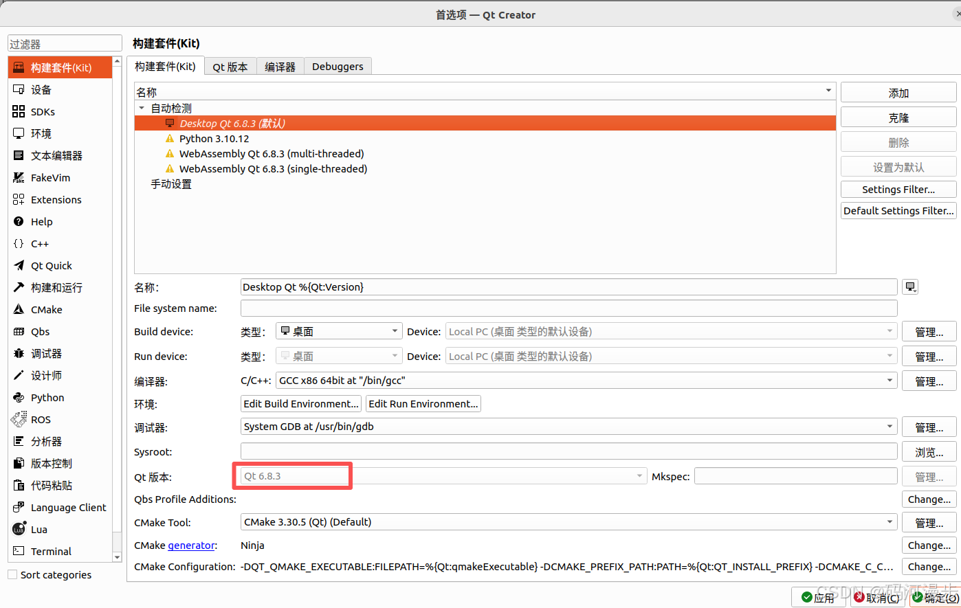3、可以看到,这是默认的是Qt6.8.3,而且他不可以修改