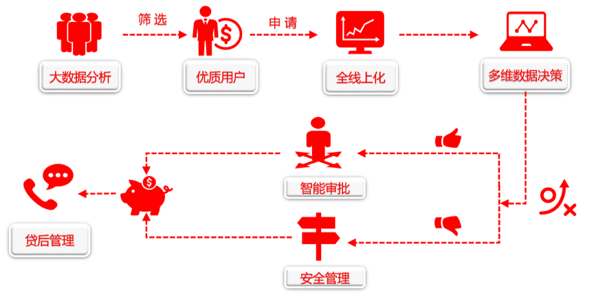 支撑整个系统全线上高效运转的风控由反欺诈、贷前、审批、贷后几个环节重点把控。筛选特定场景下大数据,构建的这套专属风控模型有其专属特色。
