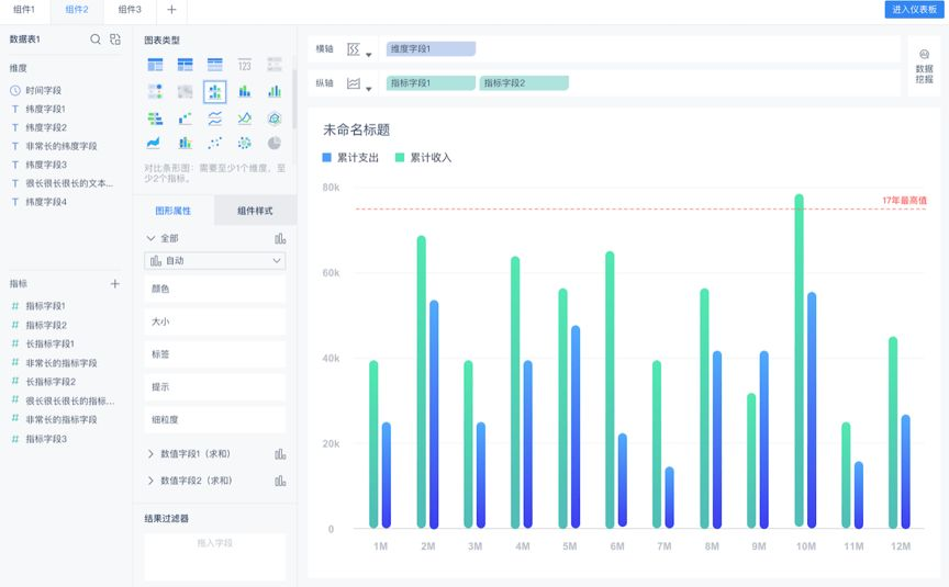可视化探索分析:FineBI 的可视化探索分析,是面向分析用户,让他们能够以最直观快速的方式,了解自己的数据,发现数据问题的模块。FineBI支持针对业务的多维度探索分析,对维度和指标分别提供了丰富的分析功能。同时FineBI还支持数十种可视化图标样式,多维度展示数据成果。