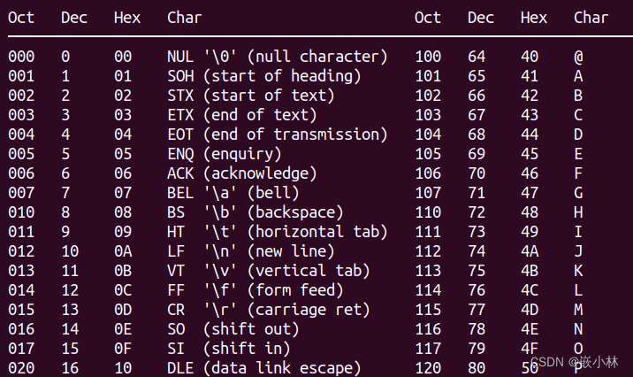 我截取了一部分ASCII码表,其中最为常见的是 ' \0 ' , ' \n ' , 数字0-9,字母a-z 以及大写A-Z。
