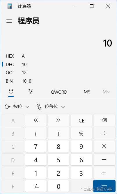 在计算器中打开程序员模式,其中BIN代表二进制,OCT为八进制,DEC为十进制,HEX为十六进制。