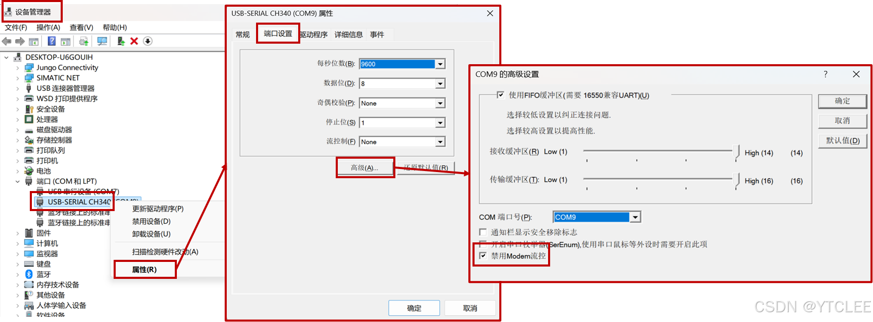 1、进入电脑设备管理器,选择连接ESP32的CH340端口→右键选择属性→选择端口设置→选择高级→勾选禁用Modem流控
