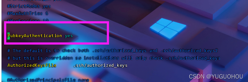 删除PubkeyAuthentication yes此行前面的#号(表示允许密钥登录)