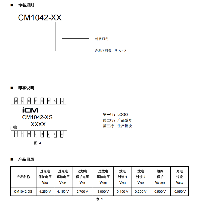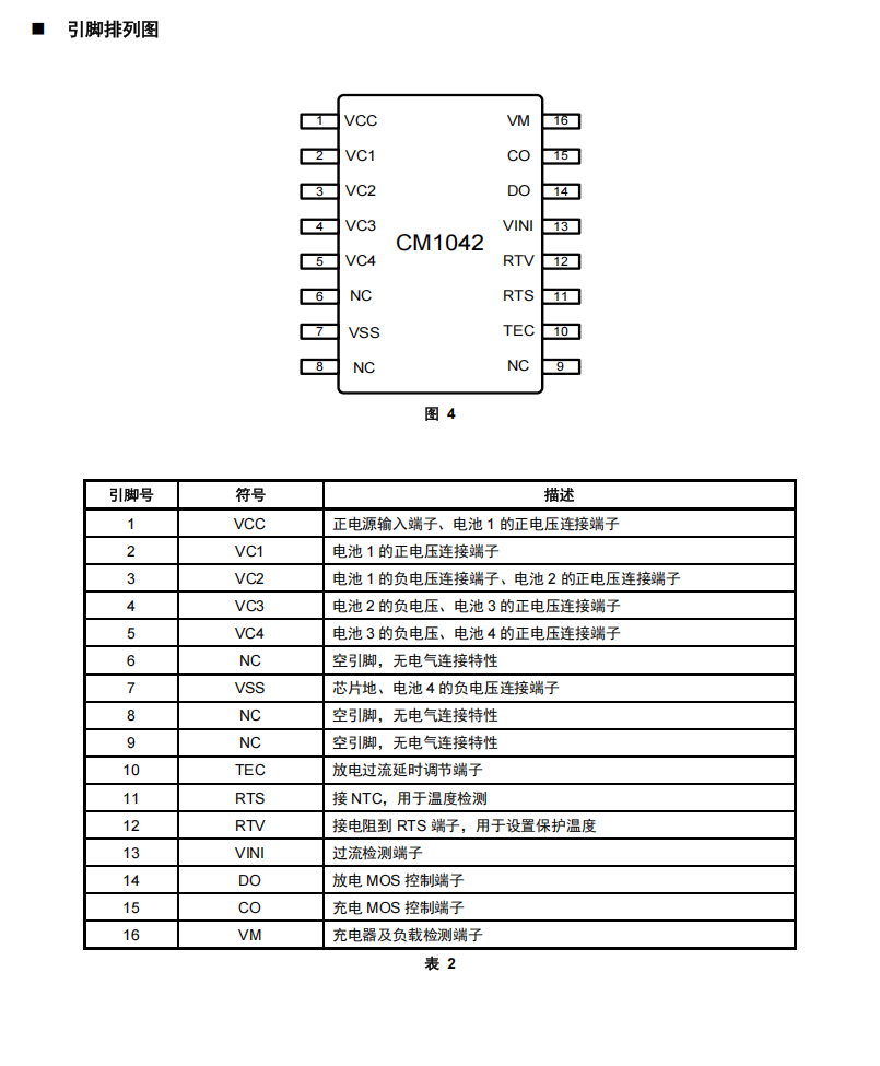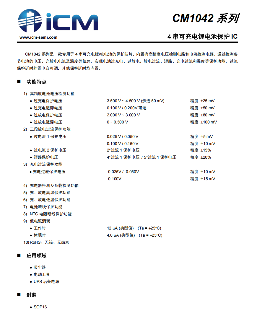 CM1042 系列是一款专用于4串可充电锂/铁电池的保护芯片,内置有高精度电压检测电路和电流检测电路,通过检测名