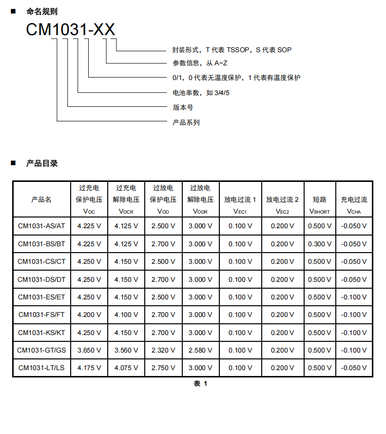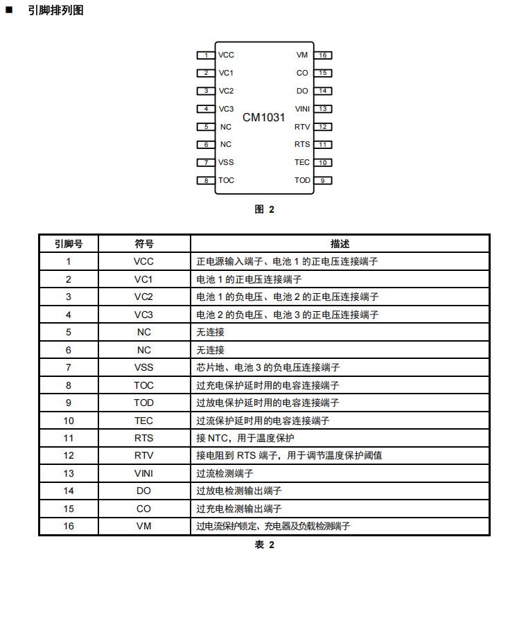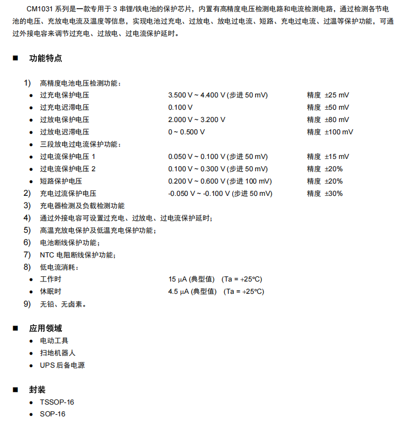 CM1031 系列是一款专用于3串锂/铁电池的保护芯片,内置有高精度电压检测电路和电流检测电路,通过检测各节电池的电压、充放电电流及温度等信息,实现电池过充电、过放电、放电过电流、短路、充电过电流、过温等保护功能,可通过外接电容来调节过充电、过放电、过电流保护延时。