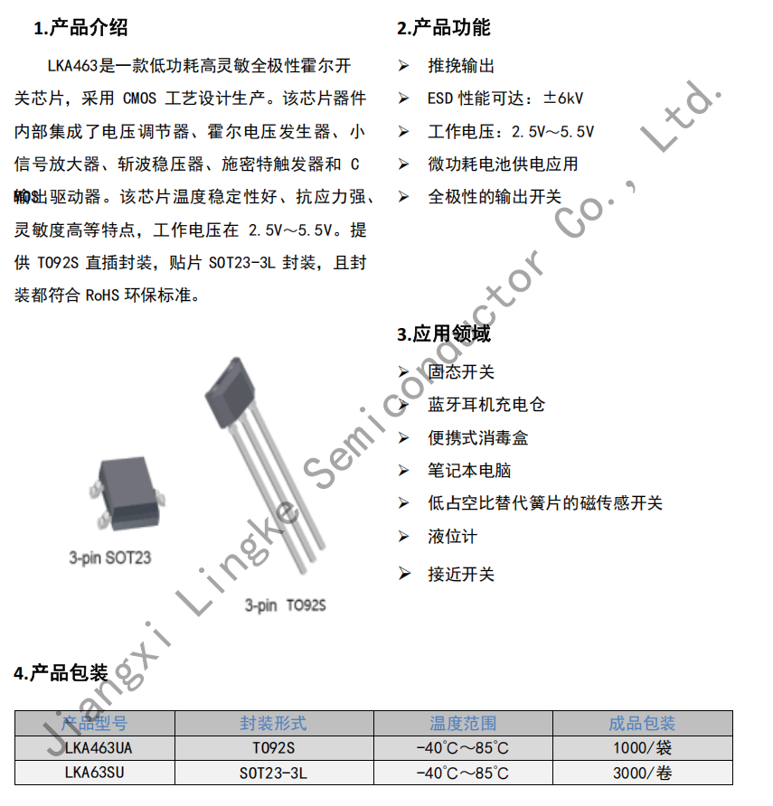 LKA463是一款低功耗高灵敏全极性霍尔开关芯片,采用 CMOS 工艺设计生产。该芯片器件 内部集成了电压调节器、霍尔电压发生器、小 信号放大器、斩波稳压器、施密特触发器和 CMOS输出驱动器,该芯片温度稳定性好、抗应力强,灵敏度高等特点,工作电压在 2.5V~5.5V。提供TO92S 直插封装,贴片 SOT23-3L 封装,且封装都符合 RoHS 环保标准。