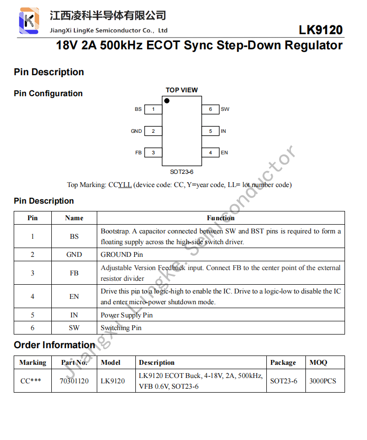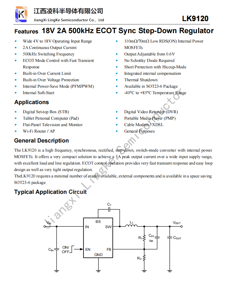 The LK9120 is a high frequency, synchronous, rectified, step-down, switch-mode converter with internal power
