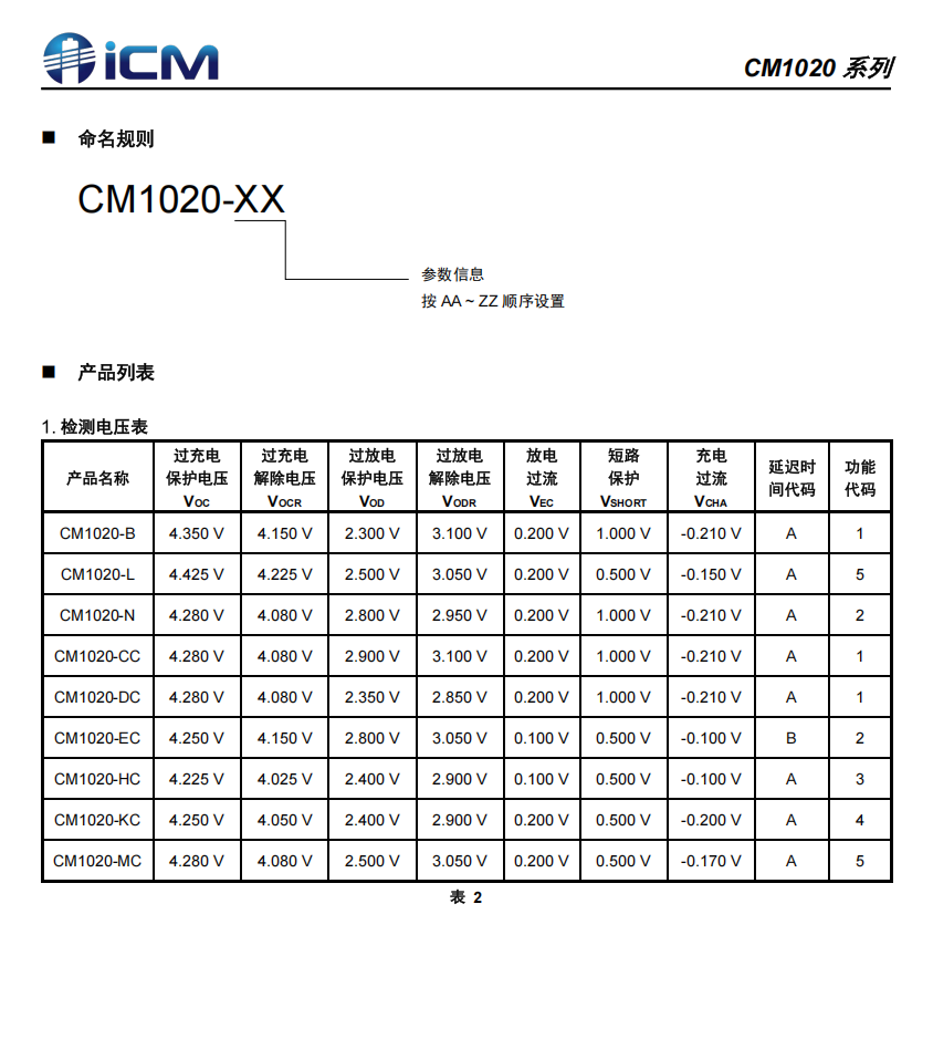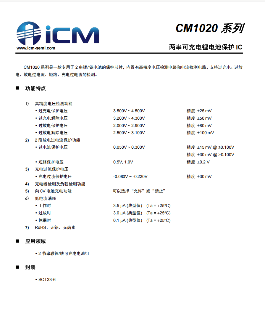 CM1020 系列是一款专用于2串锂/铁电池的保护芯片,内置有高精度电压检测电路和电流检测电路。支持过充电、过放电、放电过电流、短路、充电过电流的检测。