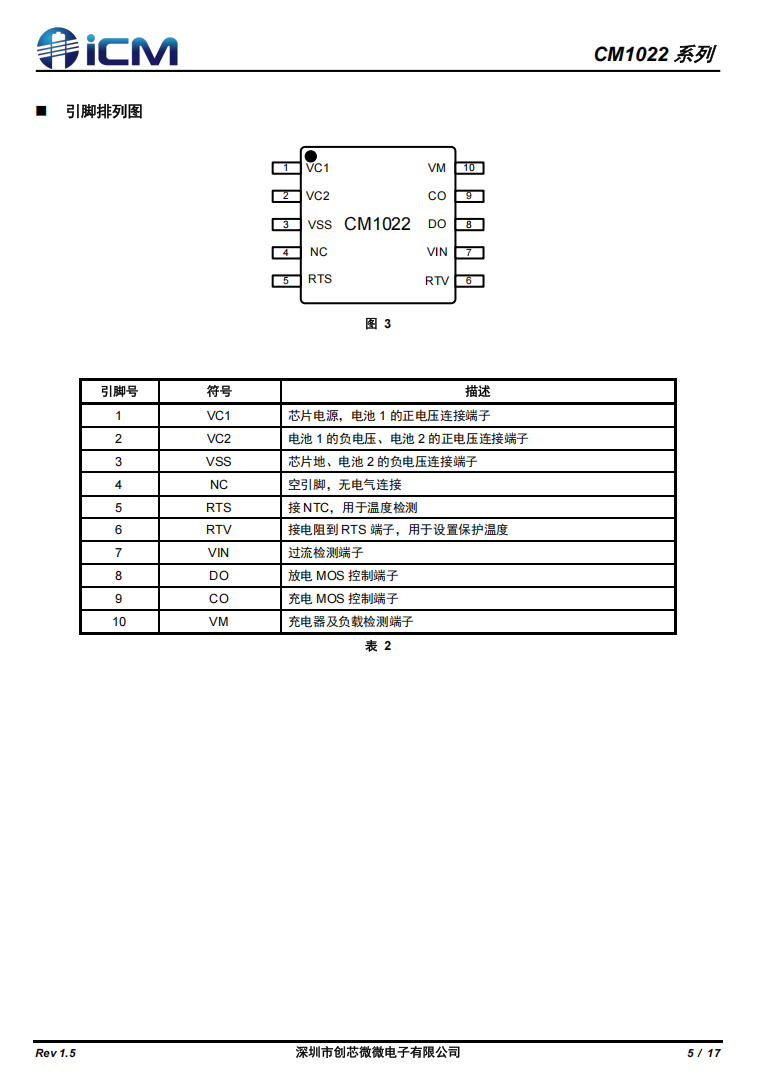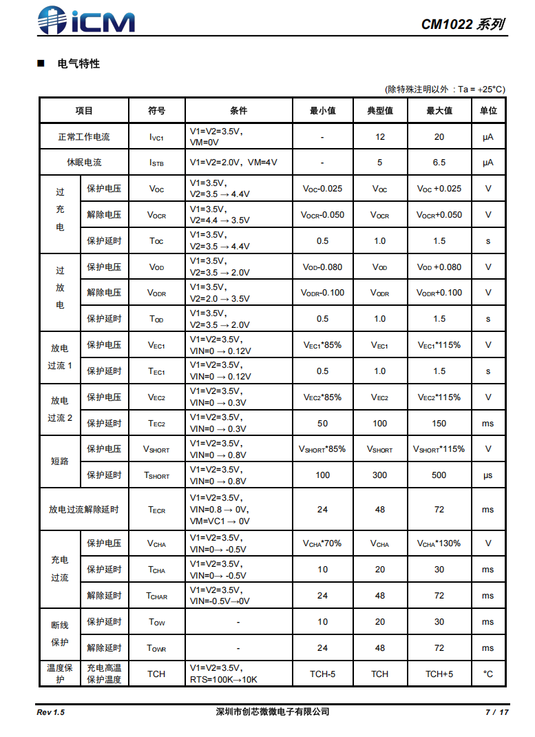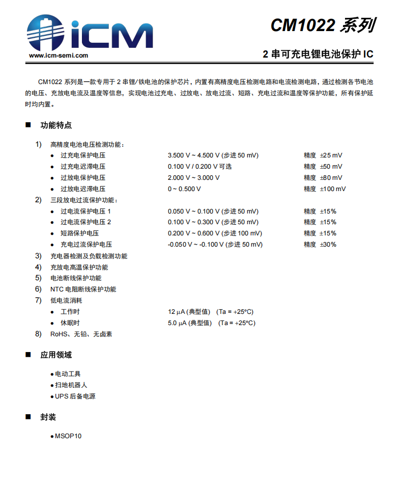 CM1022 系列是一款专用于2串锂/铁电池的保护芯片,内置有高精度电压检测电路和电流检测电路,通过检测各节电池的电压、充放电电流及温度等信息,实现电池过充电、过放电、放电过流、短路、充电过流和温度等保护功能,所有保护弧时均内置。