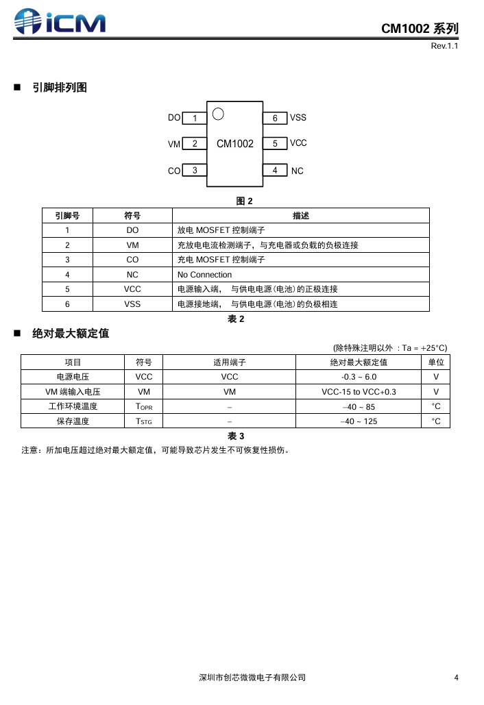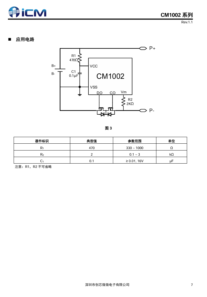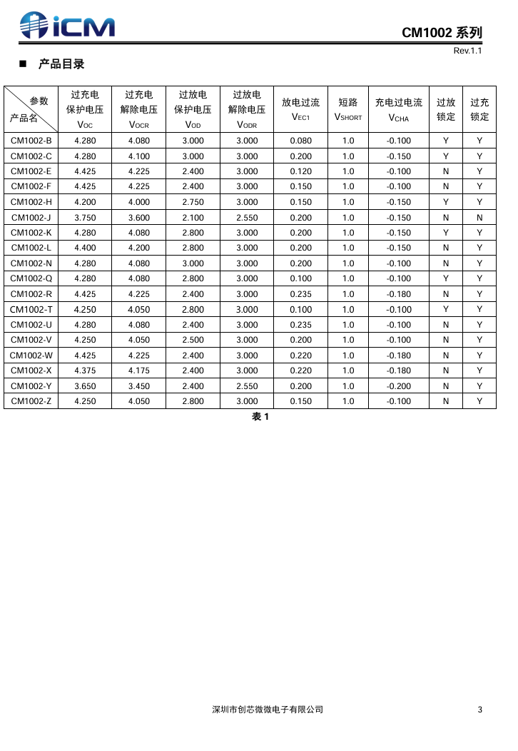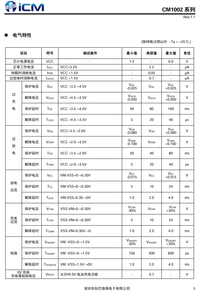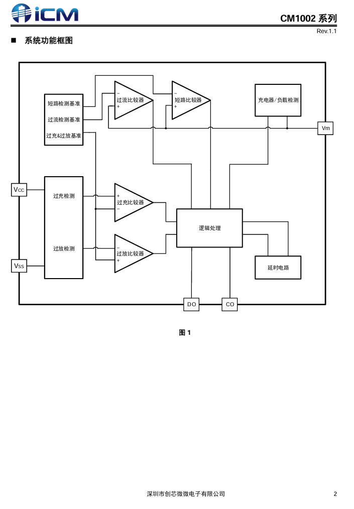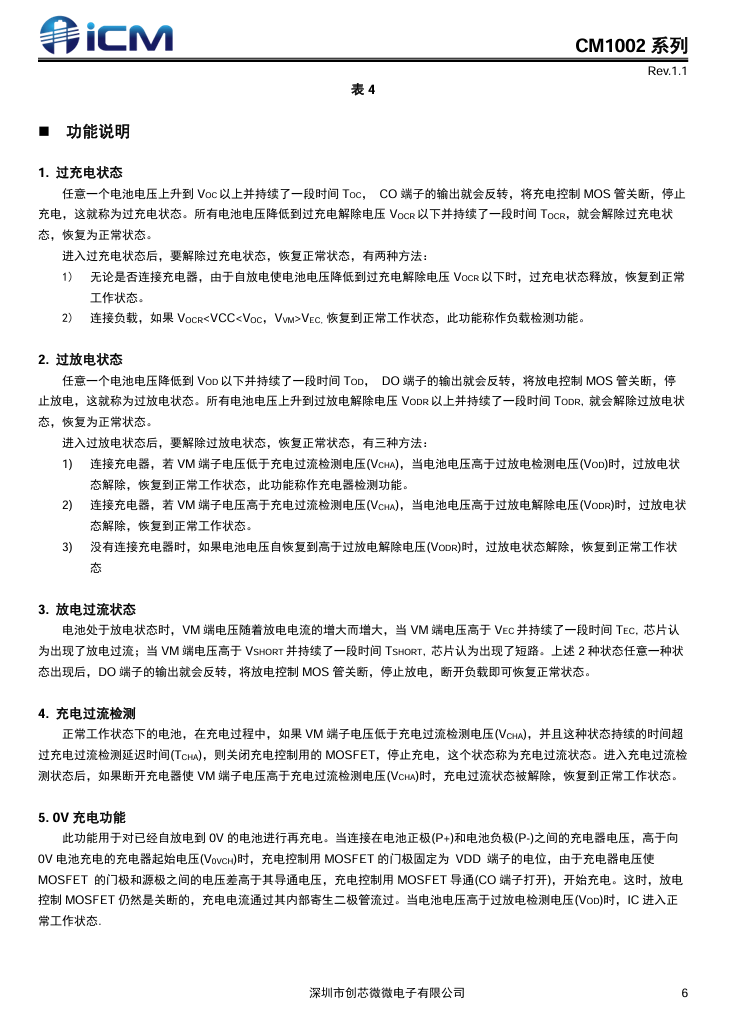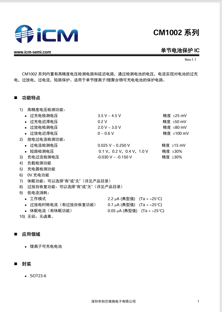 CM1002 系列内置有高精度电压检测电路和延迟电路,通过检测电池的电压,电流实现对电池的过充 电,过放电,过电流,短路保护。适用于单节锂离子/锂聚合物可充电电池的保护电路。