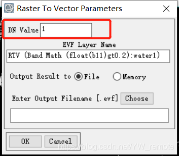 (6)在得到水体结果之后我们需要将栅格结果转出为矢量成果。栅格转换为矢量采用Classification>post Classification>Classfication to vector工具进行转换。在转换时需要设置DN值,由于我们经过指数法处理之后,将整景影像转换为了二值图,水体的DN值显示为1。