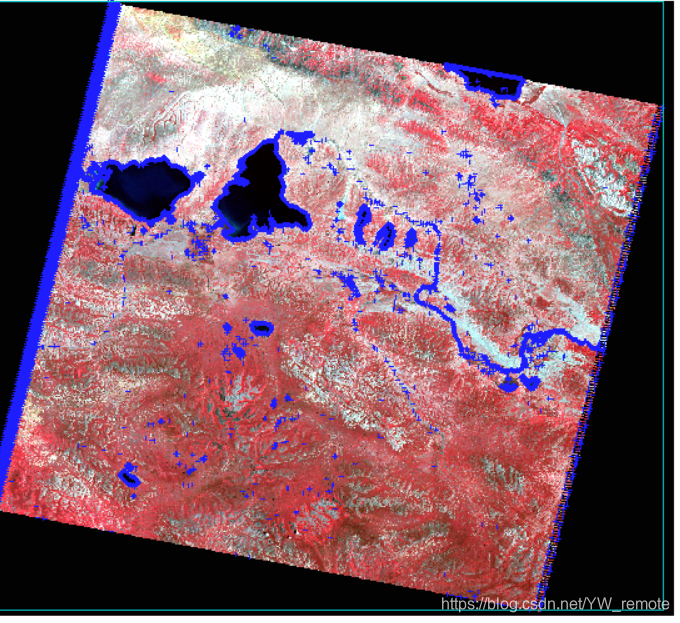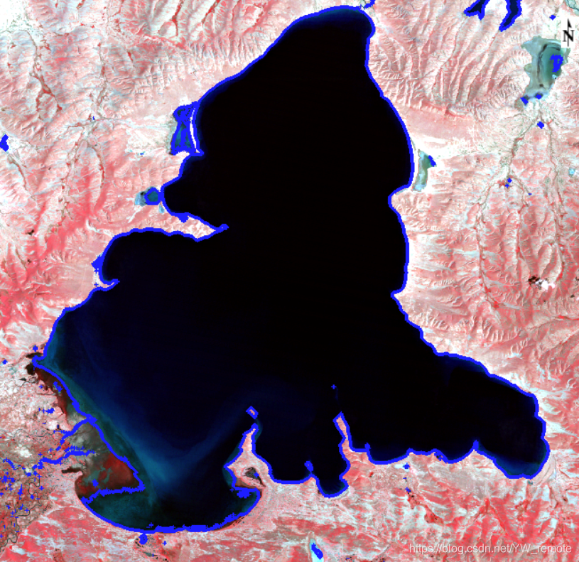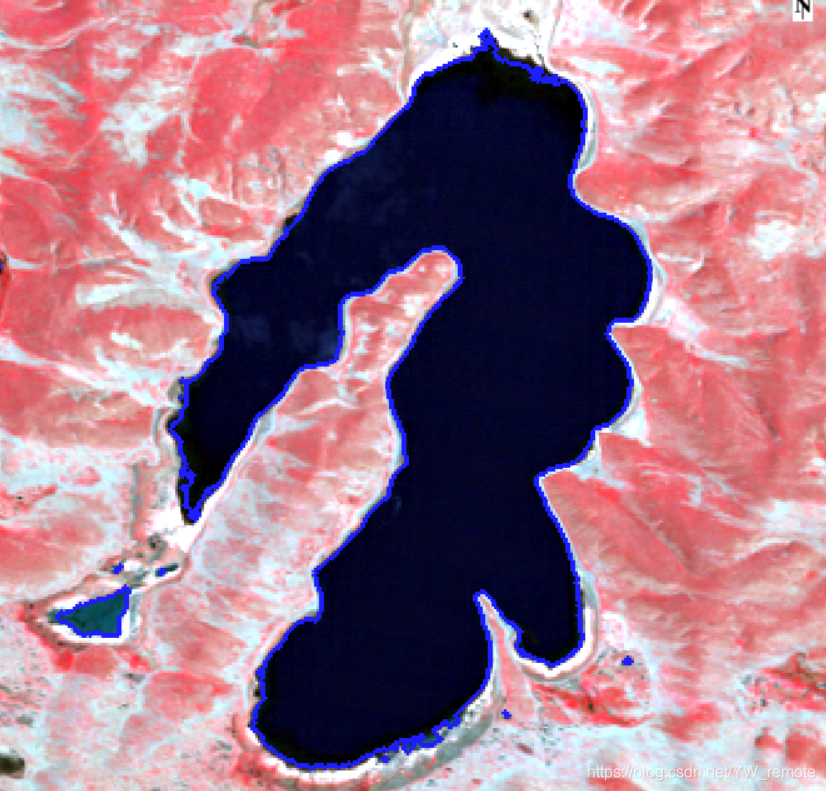 经过转换之后的结果如下图所示。图中蓝色部分即为我们使用NDWI指数提取到的水体结果。图中可以看到水体部分基本被完全提出,边界效果也较为良好。但仍存在一些小图斑或者误提的现象。而针对小图斑的问题,我们也可以继续采取一些去除小图斑的操作,并且根据自己的需要进行设定最小上图面积从而改善这一结果。