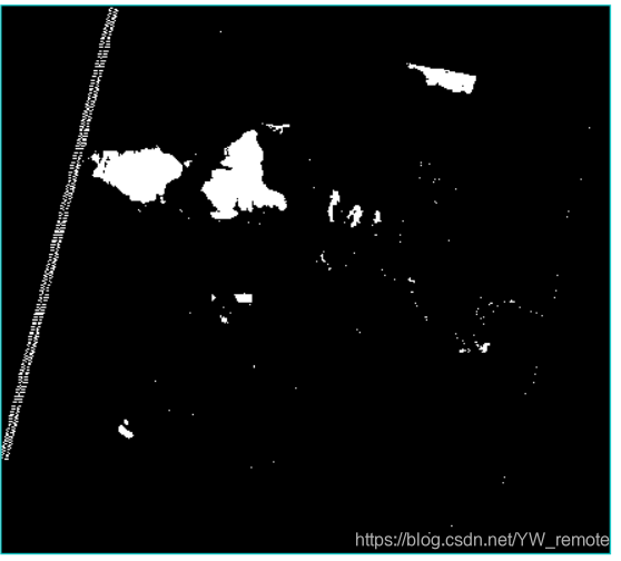(5)在得到NDWI指数结果之后,通过设定相应的阈值,再次使用Band math工具,进行提取水体结果。这里我们设定的阈值为0.2,即NDWI的值大于0.2的部分即为水体。在Band math中设置B1 gt 0.2,其中gt即代表大于的意思。设置阈值提取结果如下图,可以明显看出影像中的水体几乎被完整提取出,但由于卫星影像质量的问题,左侧的白色为影像原始的条带影响所致。