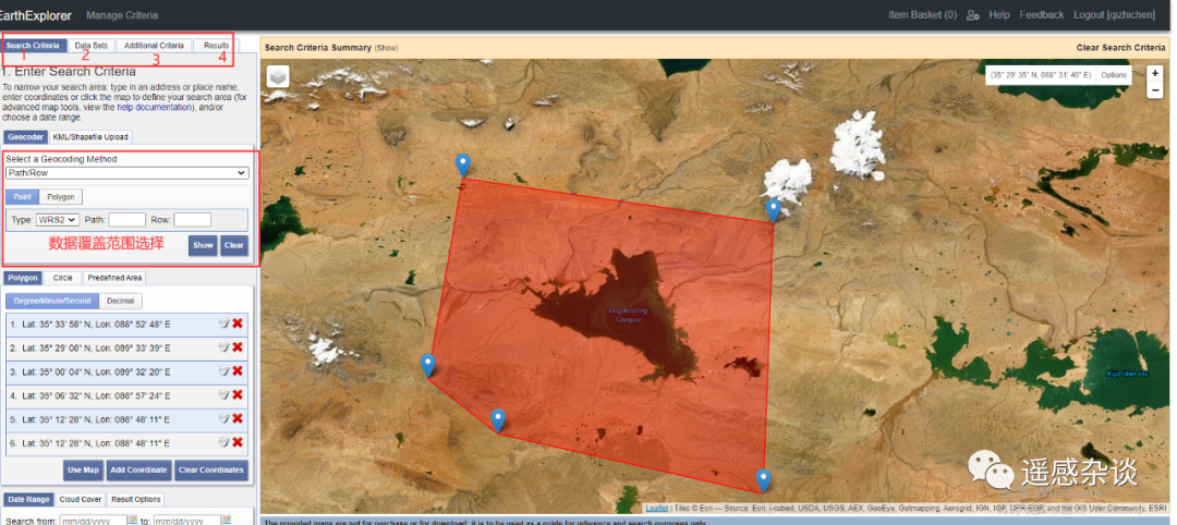 该网站也是常用的Landsat影像下载网站,我个人一般在glovis的网站出现问题的时候,会用这个网站来下载,主要是由于glovis的网站有时下载数据较慢,也可以选择切换到该网站下载,这个网站国内的网络即可完全打开。这个网站数据下载方式同glovis一致,但是数据选择方式同其有一定区别。数据的筛选总共分为四个步骤:1.影像覆盖位置选择(可以通过行列号或者手动绘制来确定);2.数据集选择;3.其他的数据信息(一般不需理会)4.结果检索
