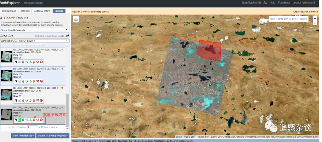 该网站是USGS下属的影像下载的网站之一,网站影像下载比较方便,查看影像的信息也极为便捷,是Landsat系列影像数据常用的下载网址(也是我最常用的下载网站)。这个网站需要科学上网才能显示影像信息,并且下载数据极为方便,使用自带的软件Bulk即可进行批量下载。影像的检索以及下载方法如下图所示: