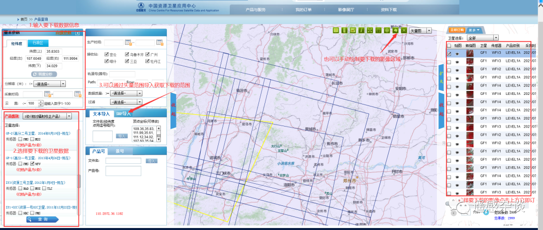 网站注册账号的时候需要填写手机号,部分号段不能注册。并且这个网站不能用谷歌浏览器打开,可以用360浏览器或者qq浏览器打开,且这个网站还存在一个问题就是在查询影像部分,如果出现打不开数据查询界面,可以重新下载flash安装即可解决。注册的账号通过审核后,一般是能够下载16米分辨率WFV传感器的GF1数据,16米分辨率的GF6数据、中巴地球资源卫星04星数据以及环境卫星(HJ-1A / HJ-1B)的数据。
