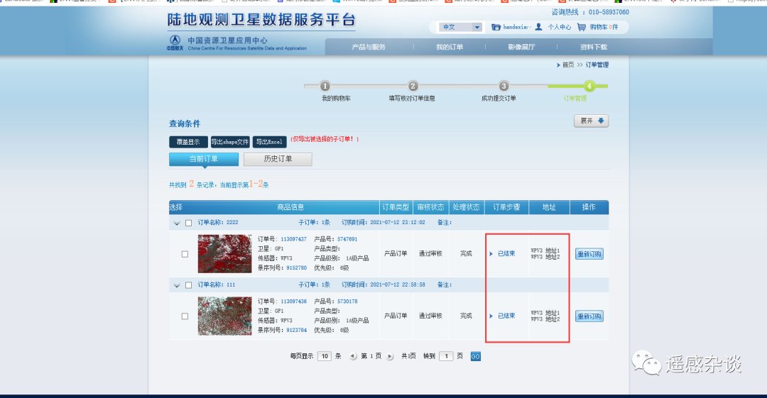 订购之后,进入购物车即可看到要订购的数据,点击生成订单,并提交订单,之后会在订单管理界面看到订购的数据的信息。在订单管理界面中看到处理过程状态为通过审核(一般这个过程中需要等待十几分钟,如果一直没成功可以给官网上电话联系并说明,一般会给予解决),并给出两个下载链接之后即可通过该链接下载所订购的数据。