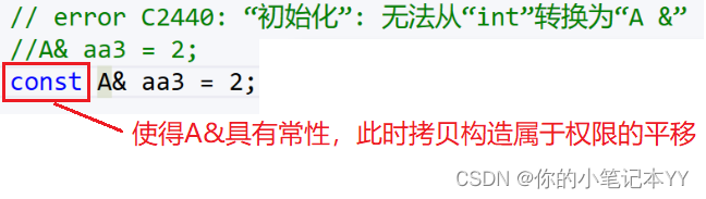 - 只能存在权限平级和权限缩小的情况,不能存在权限放大的情况。通俗而言:权限低的不能给权限(常性)强的取别名。