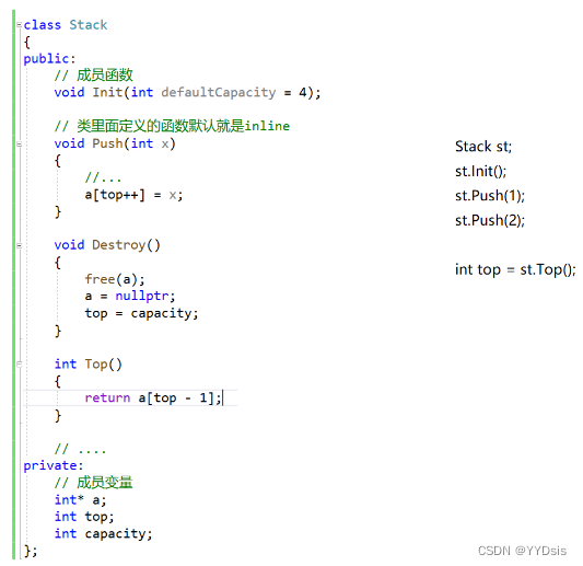 2.类中的函数默认是内联函数,具体是否是内联函数编译器会判断。如果将其定义和声名分开,即类放在.h文件,定义函数放在.cpp文件,函数不为内联函数。