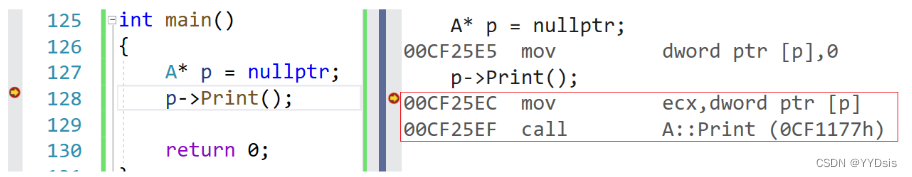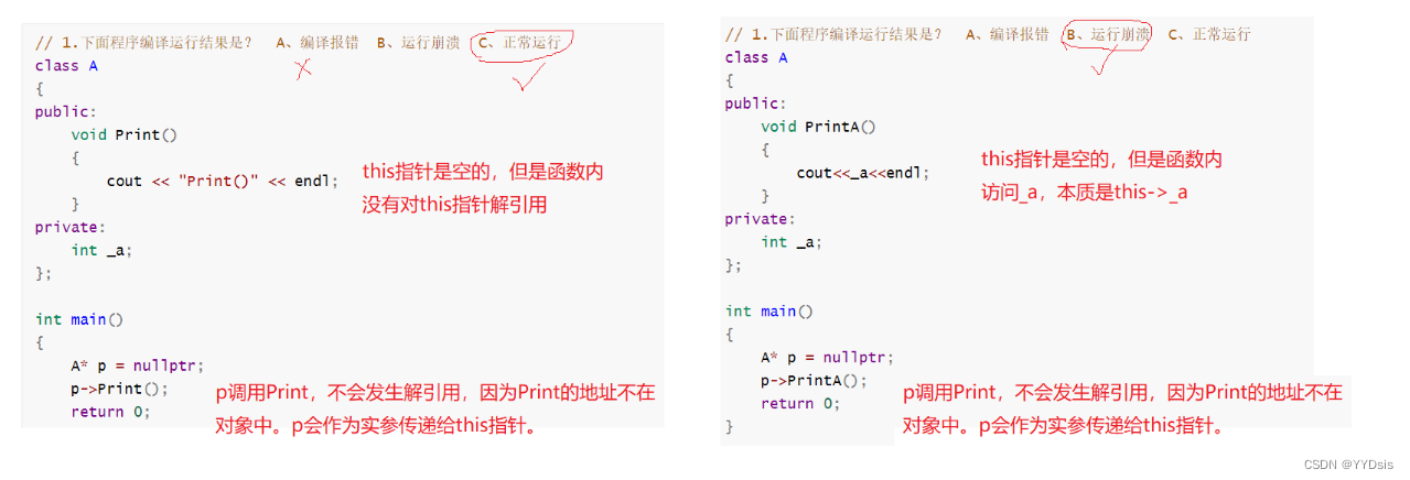 void Print() { // this不能在形参和实参显示传递,但是可以在函数内部显示使用 //this = nullptr; cout << this << endl; cout << this->_year << "-" << _month << "-" << _day << endl; }